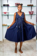 ADRIANNA PAPPEL NAVY BLUE FLORAL SEQUENCE EVENING GOWN