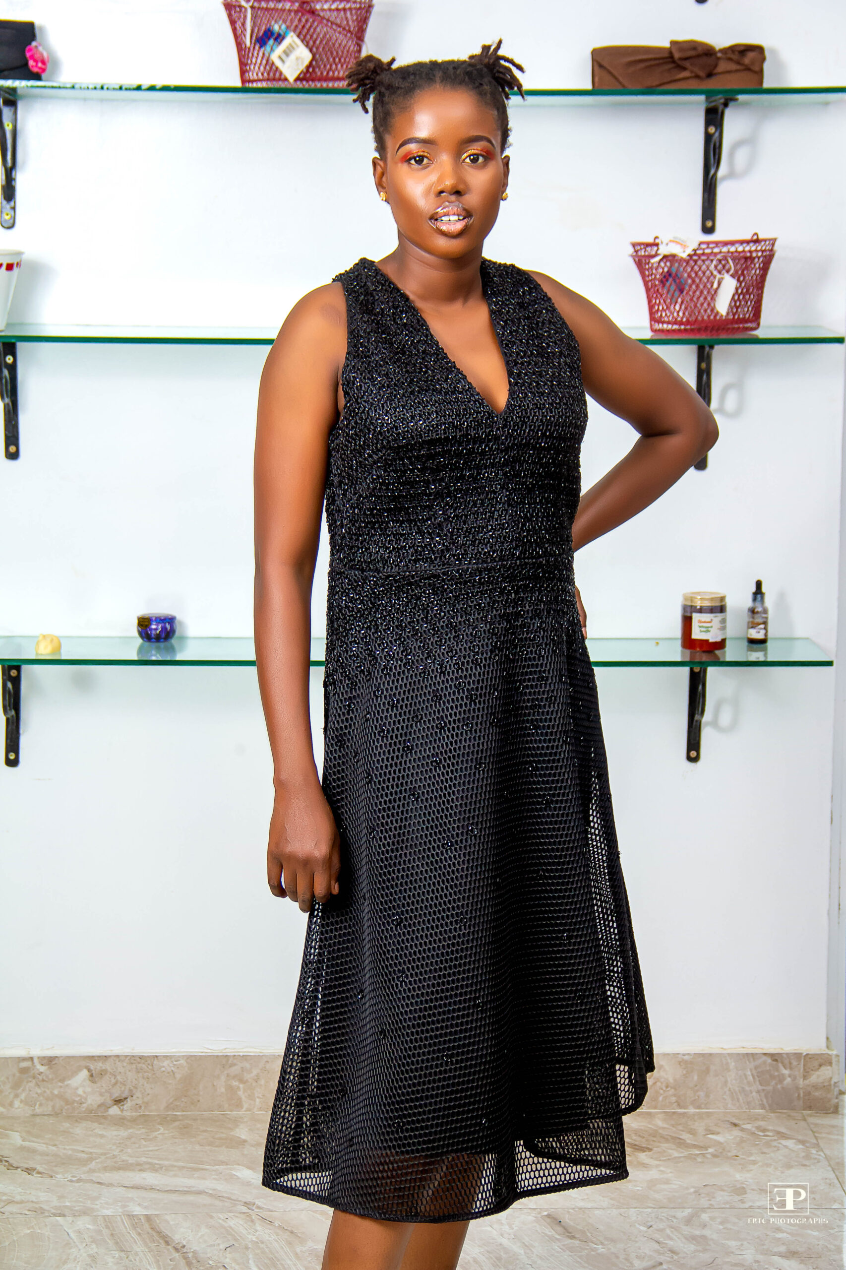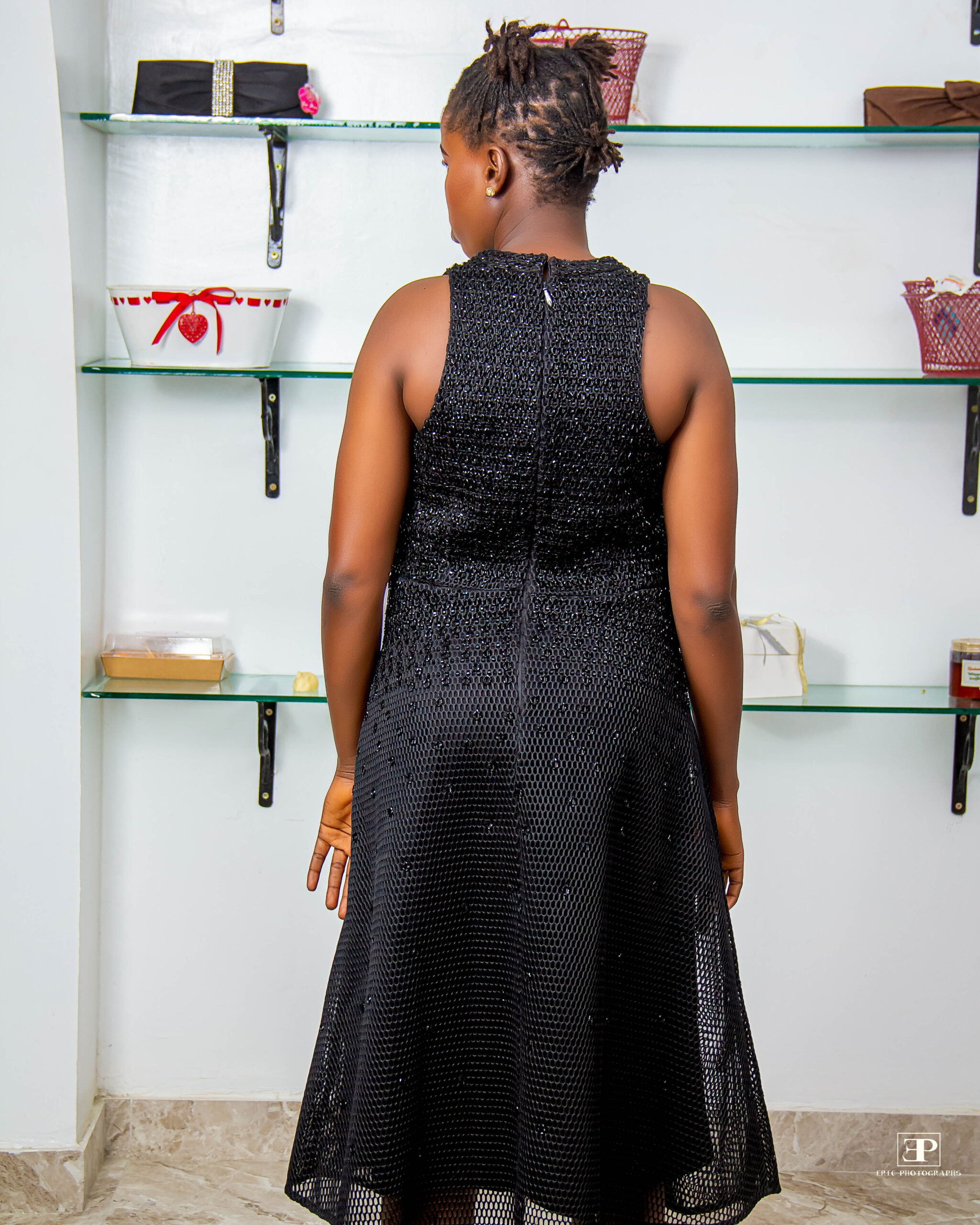 AIDAN MATOX BLACK THICK MESH FULL BEADED SLEEVELESS V-NECK FIT AND FLARED MIDI EVENING DRESS