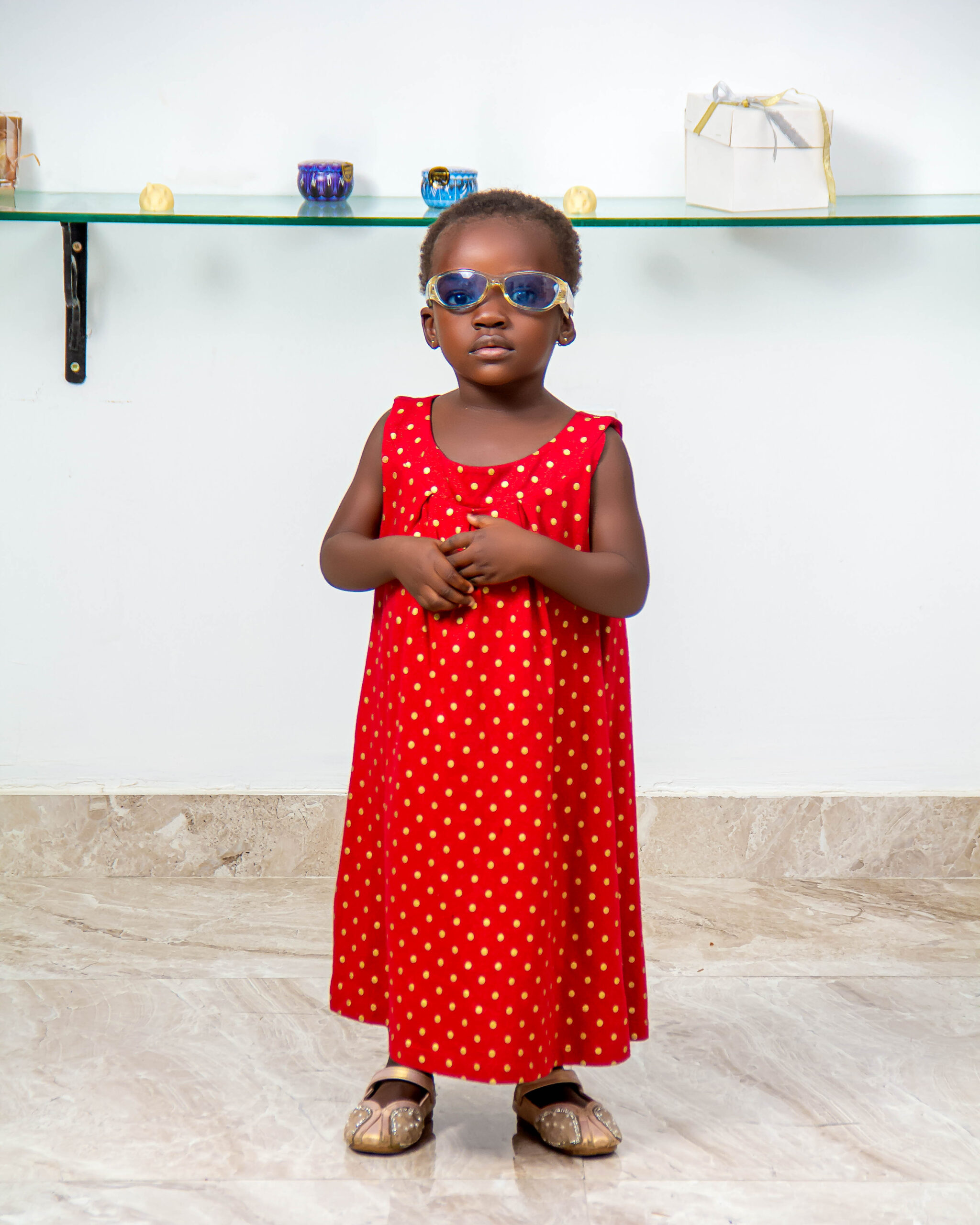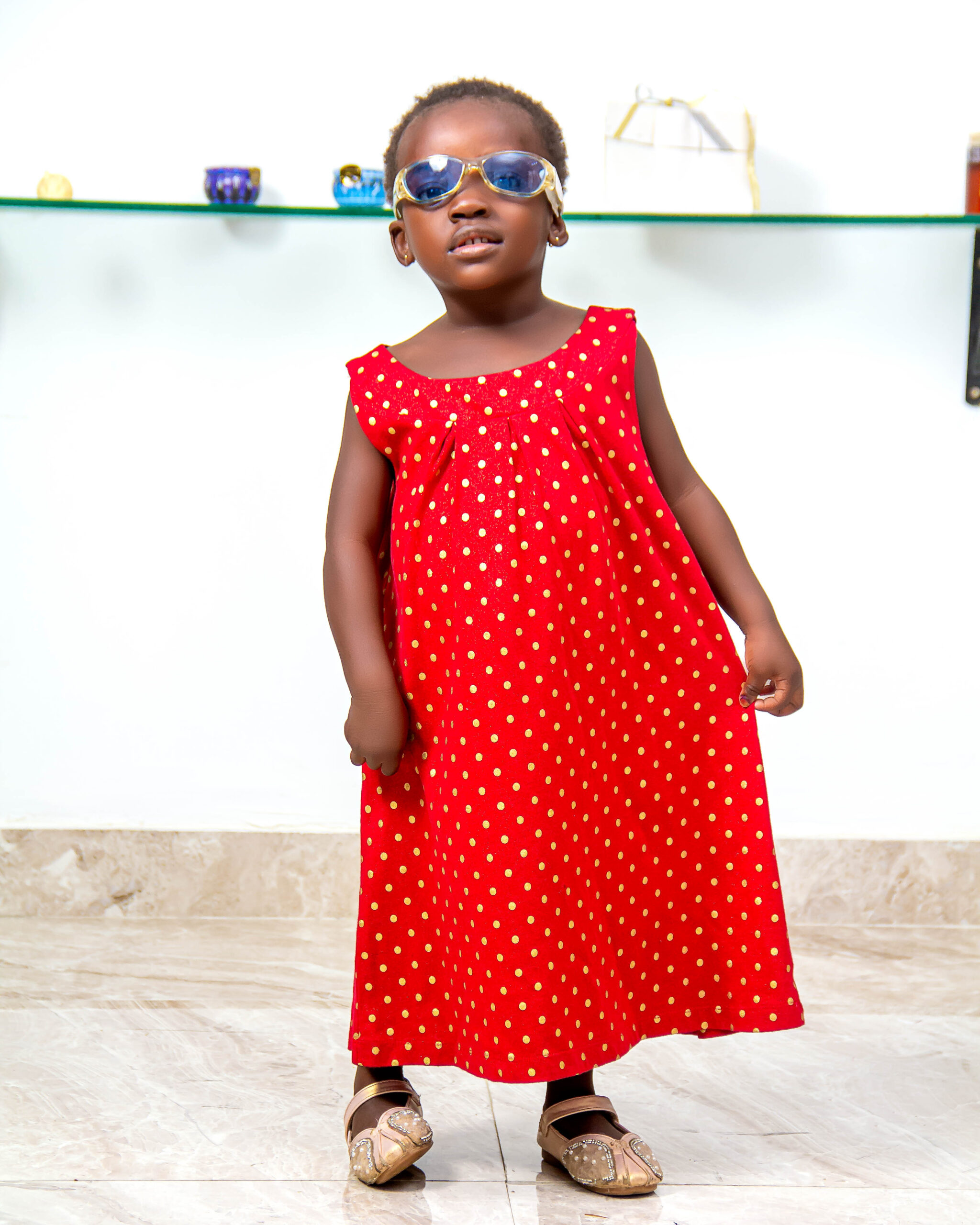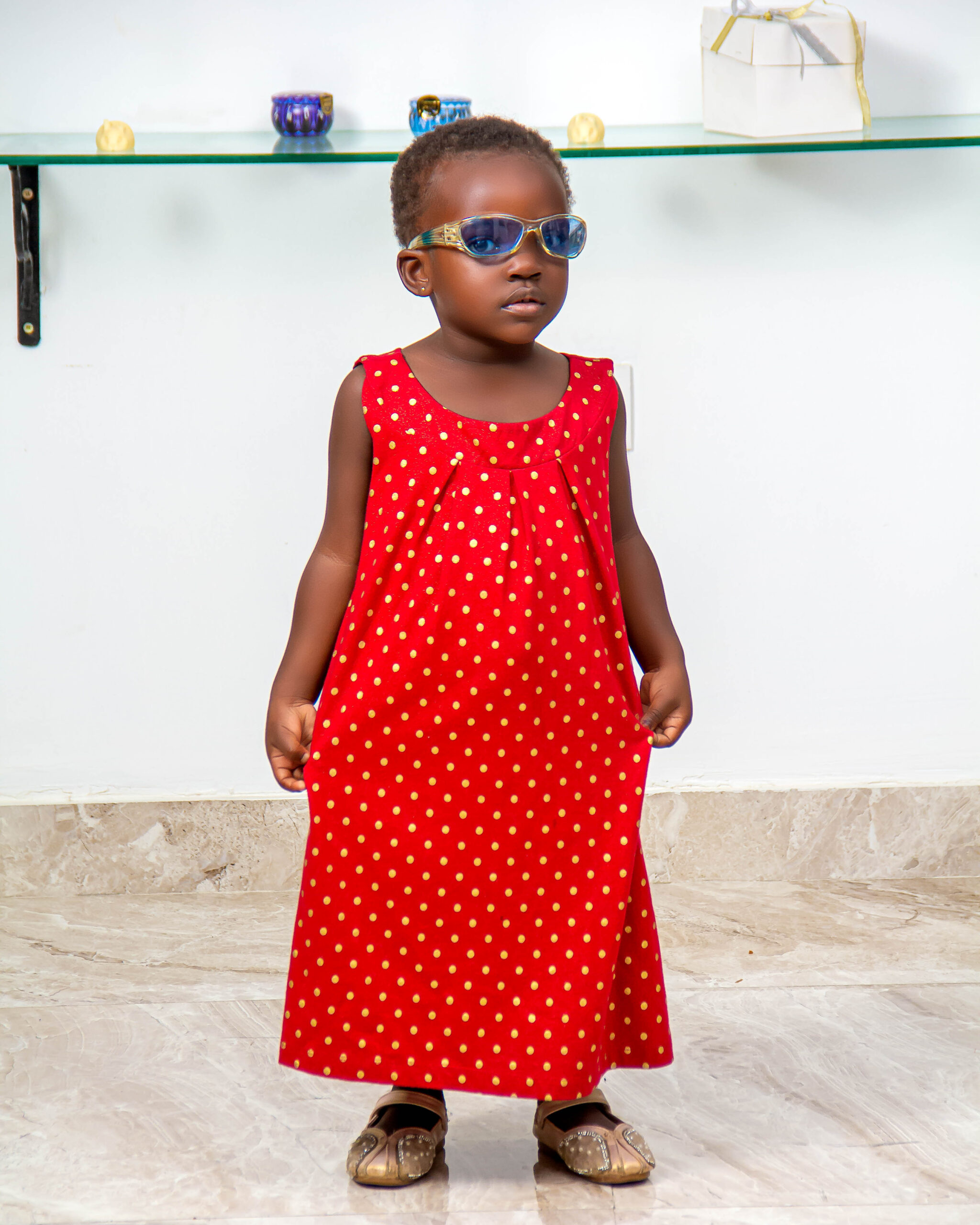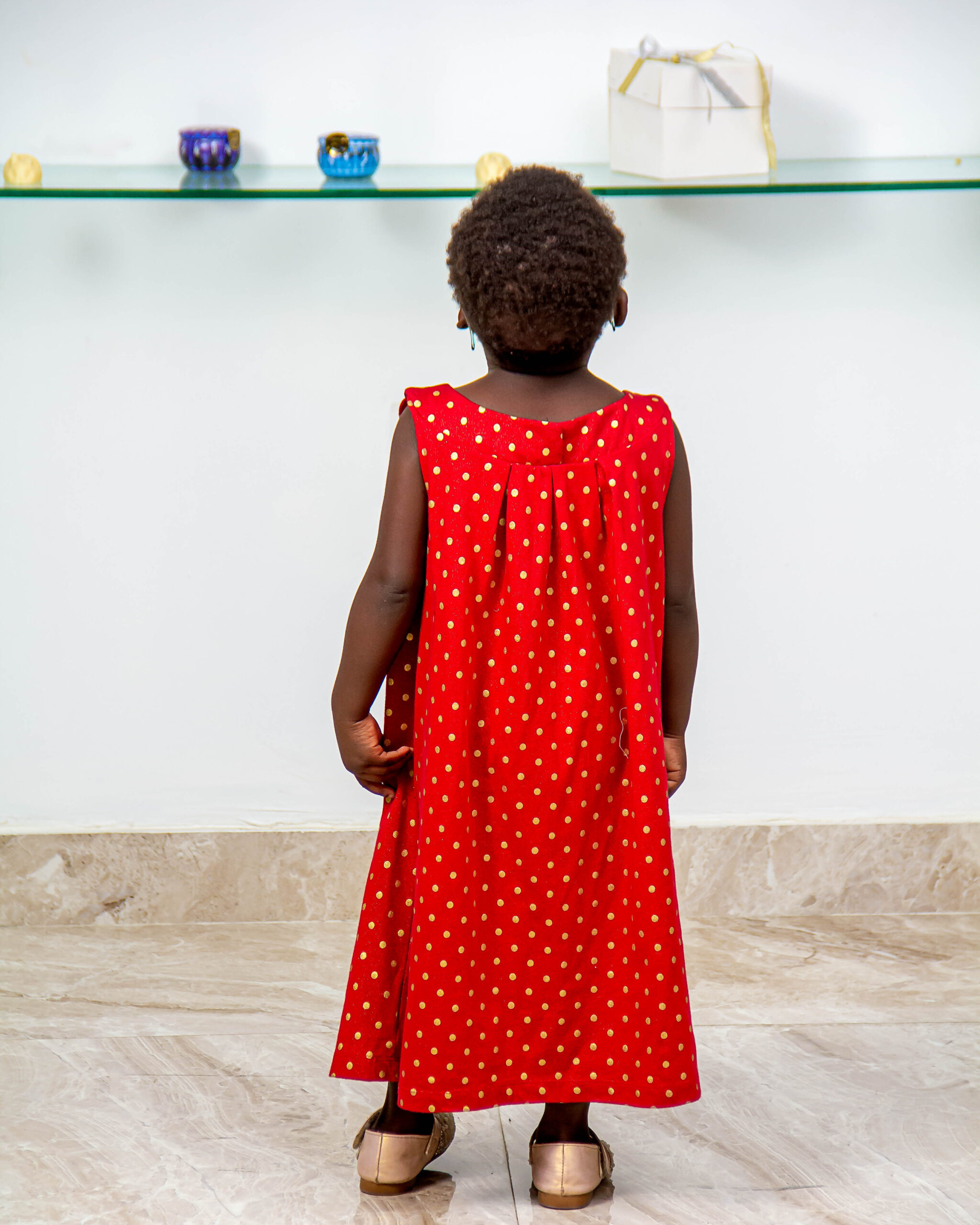 RED SPANDEX A-LINE SLEEVELESS GIRL DRESS WITH GLAZED GOLD SPOTS WITH TINY PLEAT NECK DEATIL& BACK BOTTON