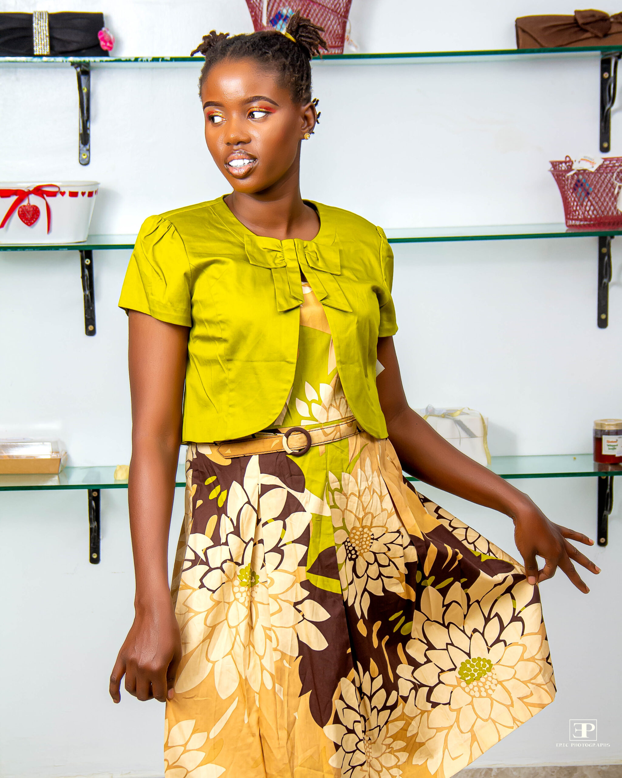 CREAM/CHOC/GREEN FLORAL SLEEVELESS DRESS WITH GREEN SHORTSLEEVE JACKET WITH BOW CHEST