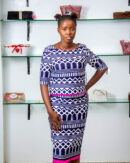 NAVY AND IVORY HIGH WAIST GEO PRINT SPANDEX SKIRT WITH FUSHIA HEM & NAVY /IVORY 3/4 SLV CROP TOP WITH FUSHIA DETAIL LAYER WAIST& GOLD INVICIBLE BACK ZIP
