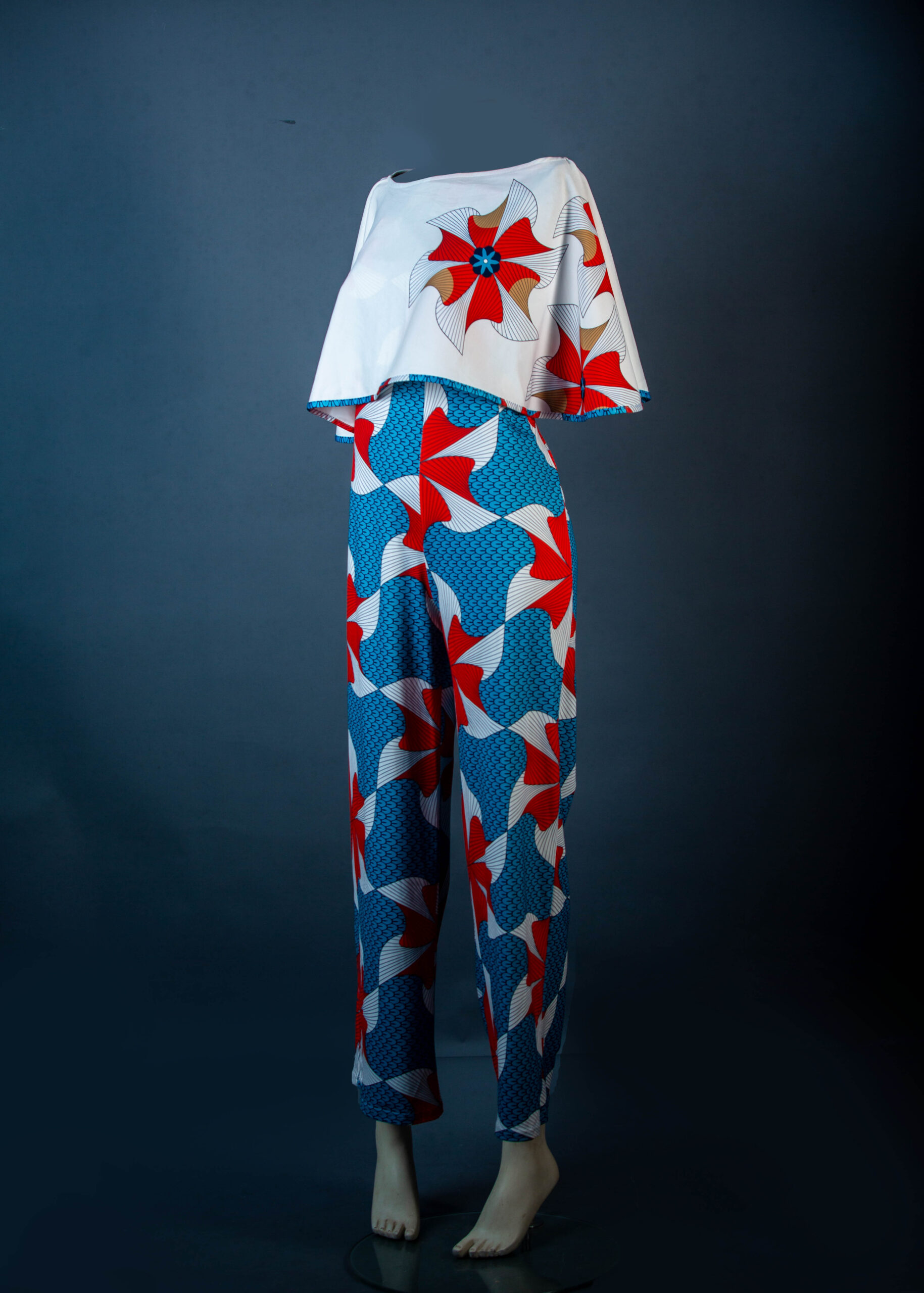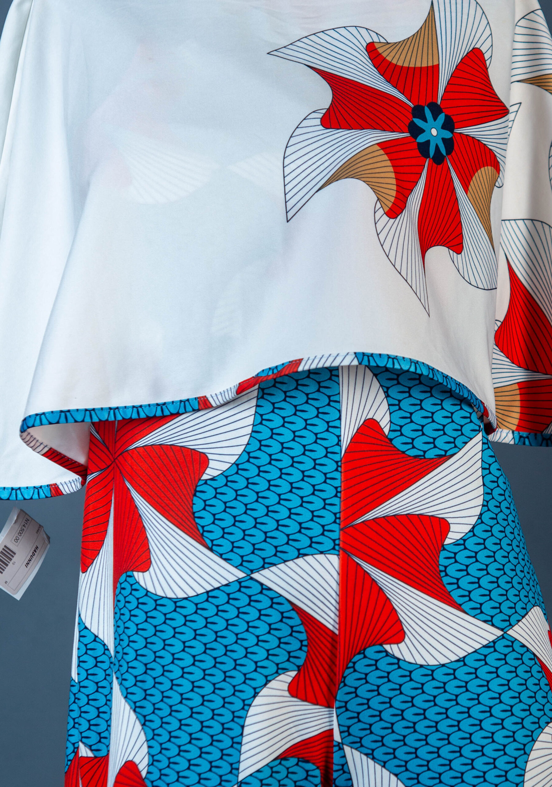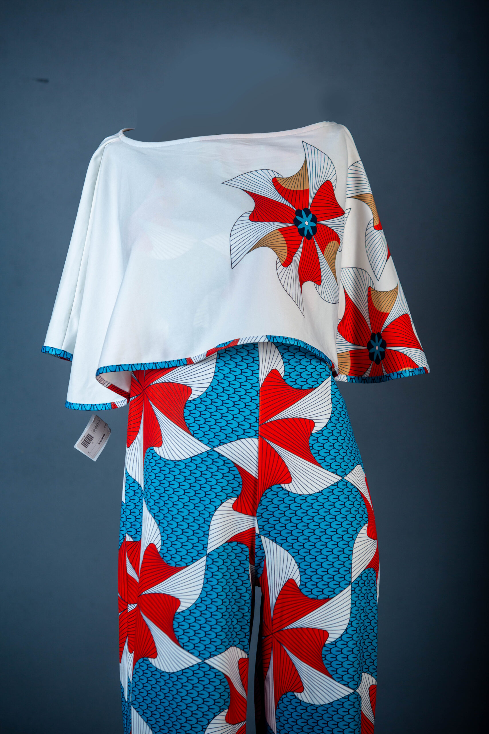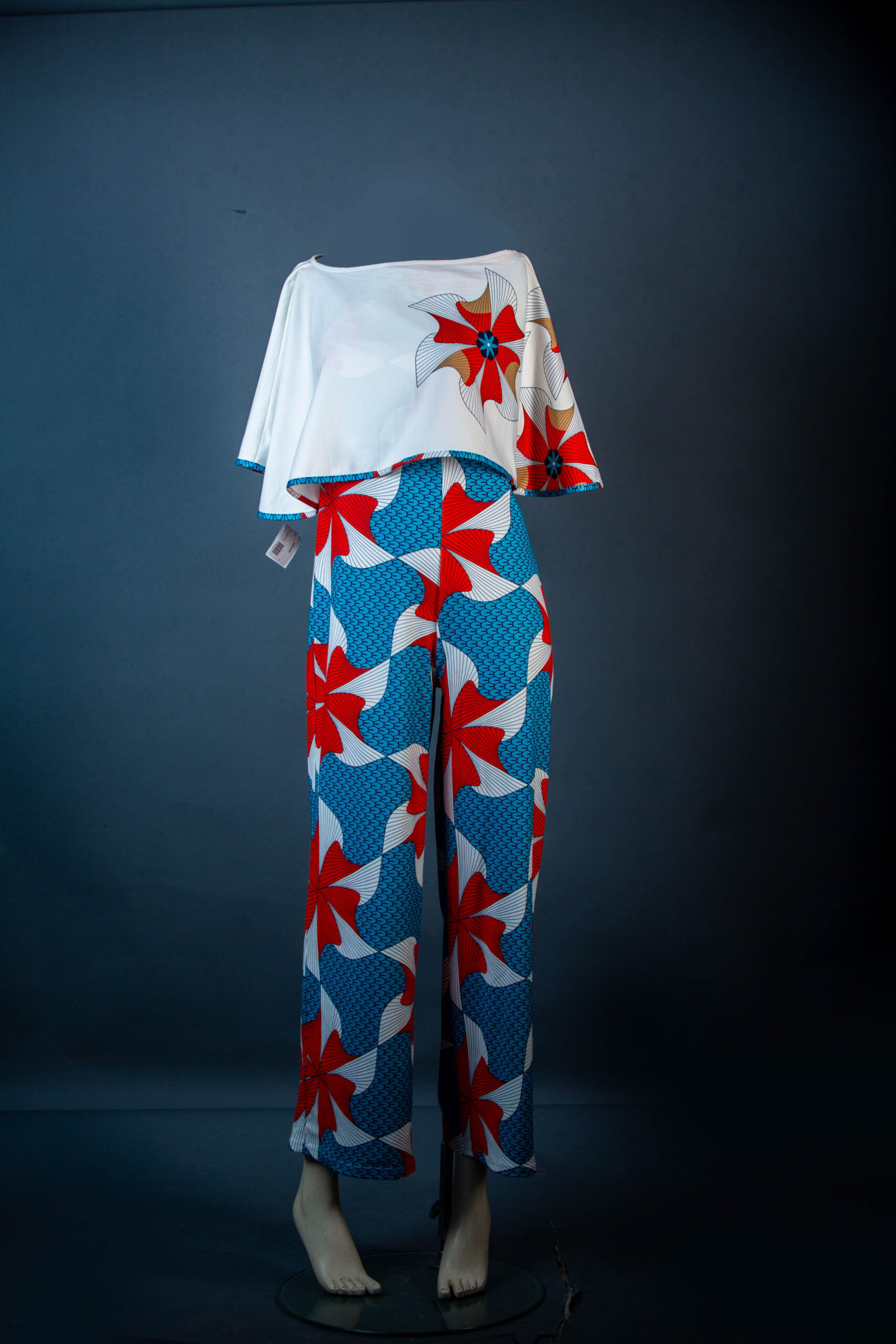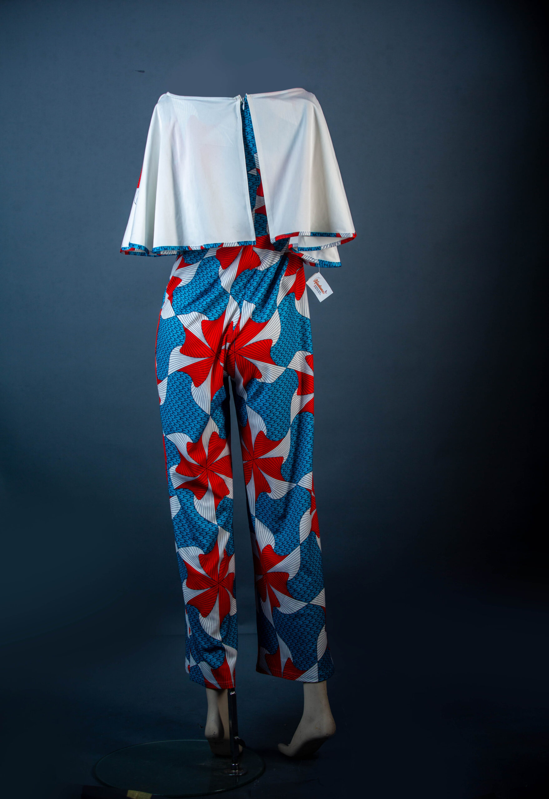 ORANGE/WHITE/BLUE BAGGY GEOPRINT JUMPSUIT WITH WHITE CAPE