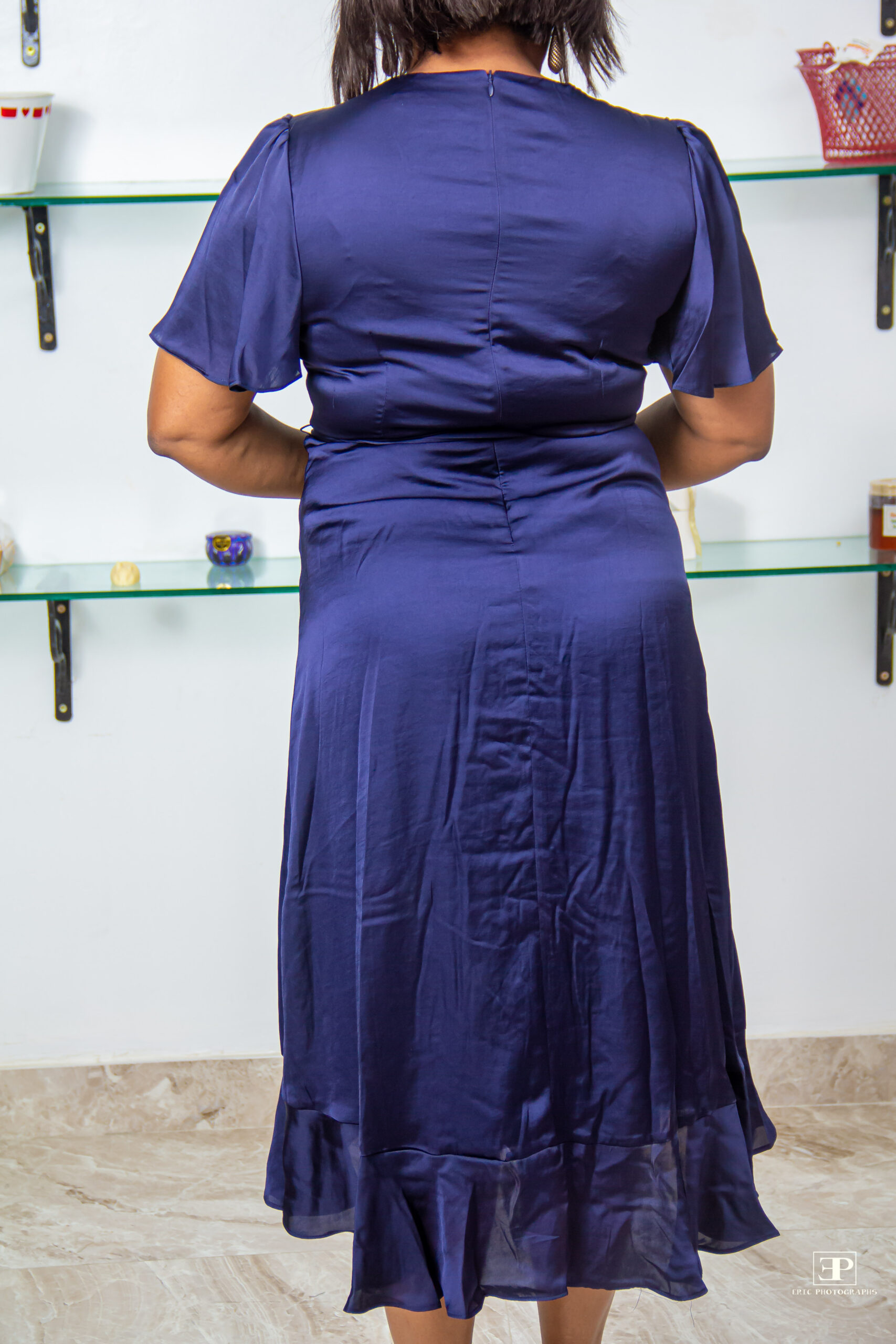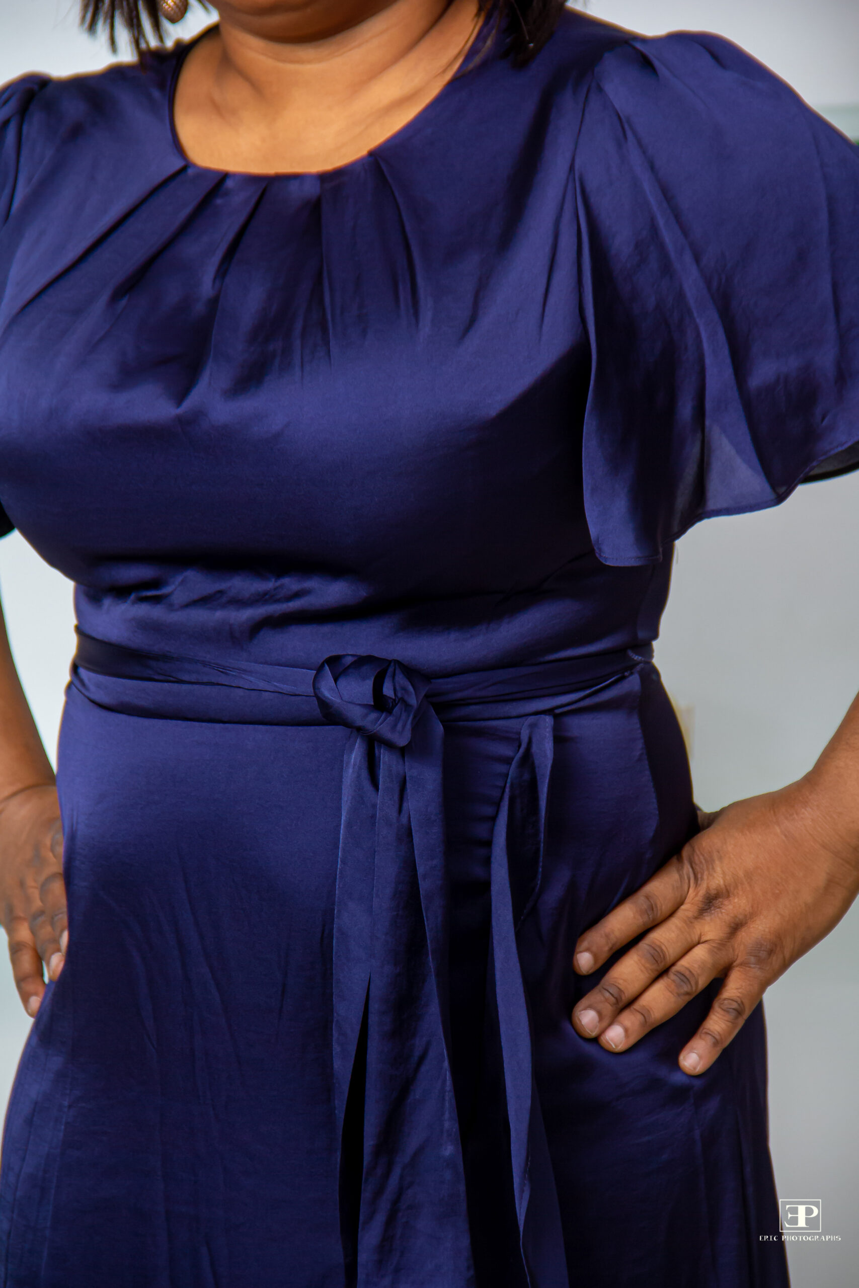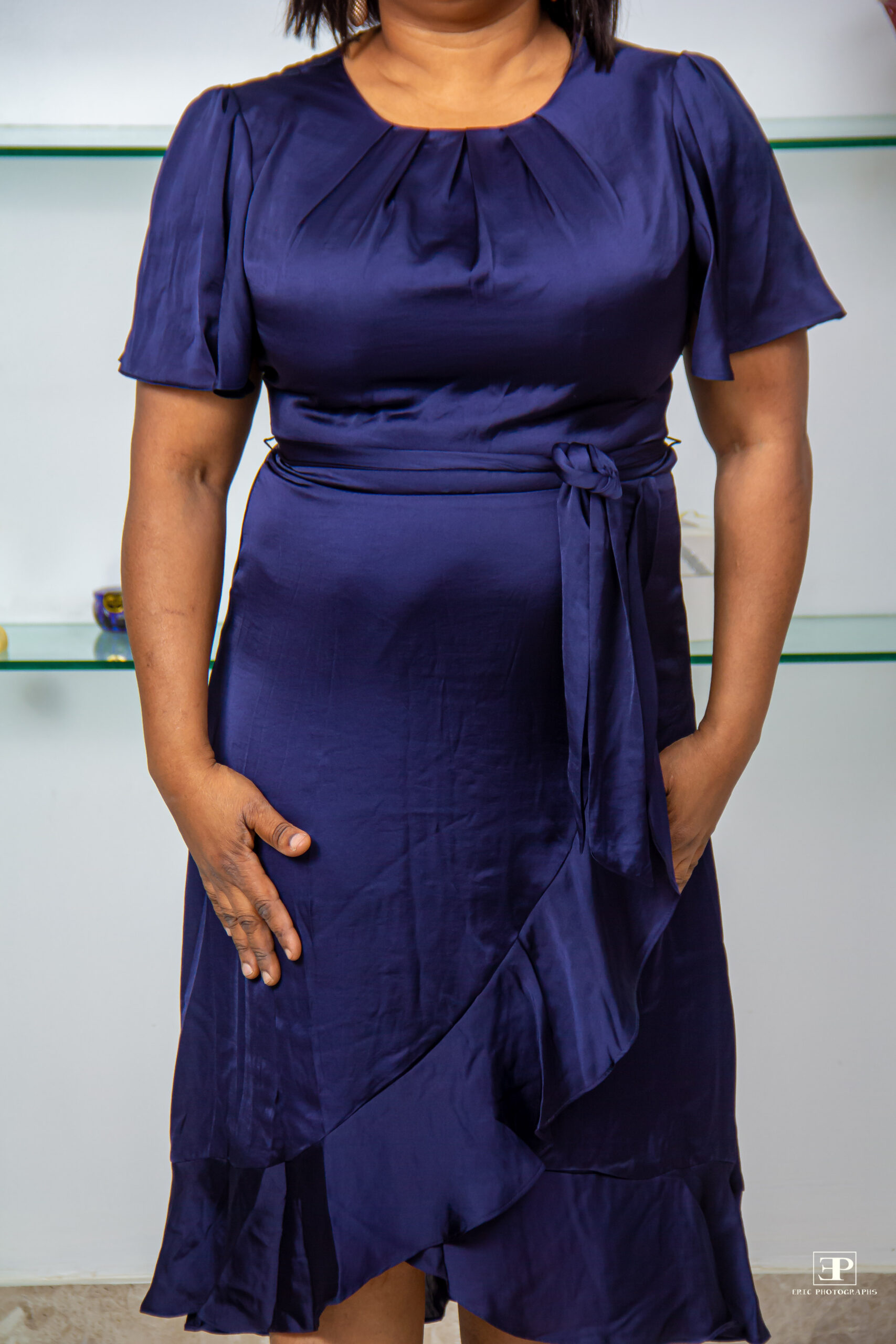 JESSICA HOWARD NAVY BLUE SILK BUTTERFLY SHORT SLV WITH FAUX WRAP HIP WITH SMALLGATHERS DETAILS AND MATCHING BELT