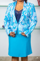 LILAC/BLUE/WHITE GEOPRINT MULTICOLOR LONGSLEEVE JACKET & BLUE FIT AND FLARED MIDI SKIRT