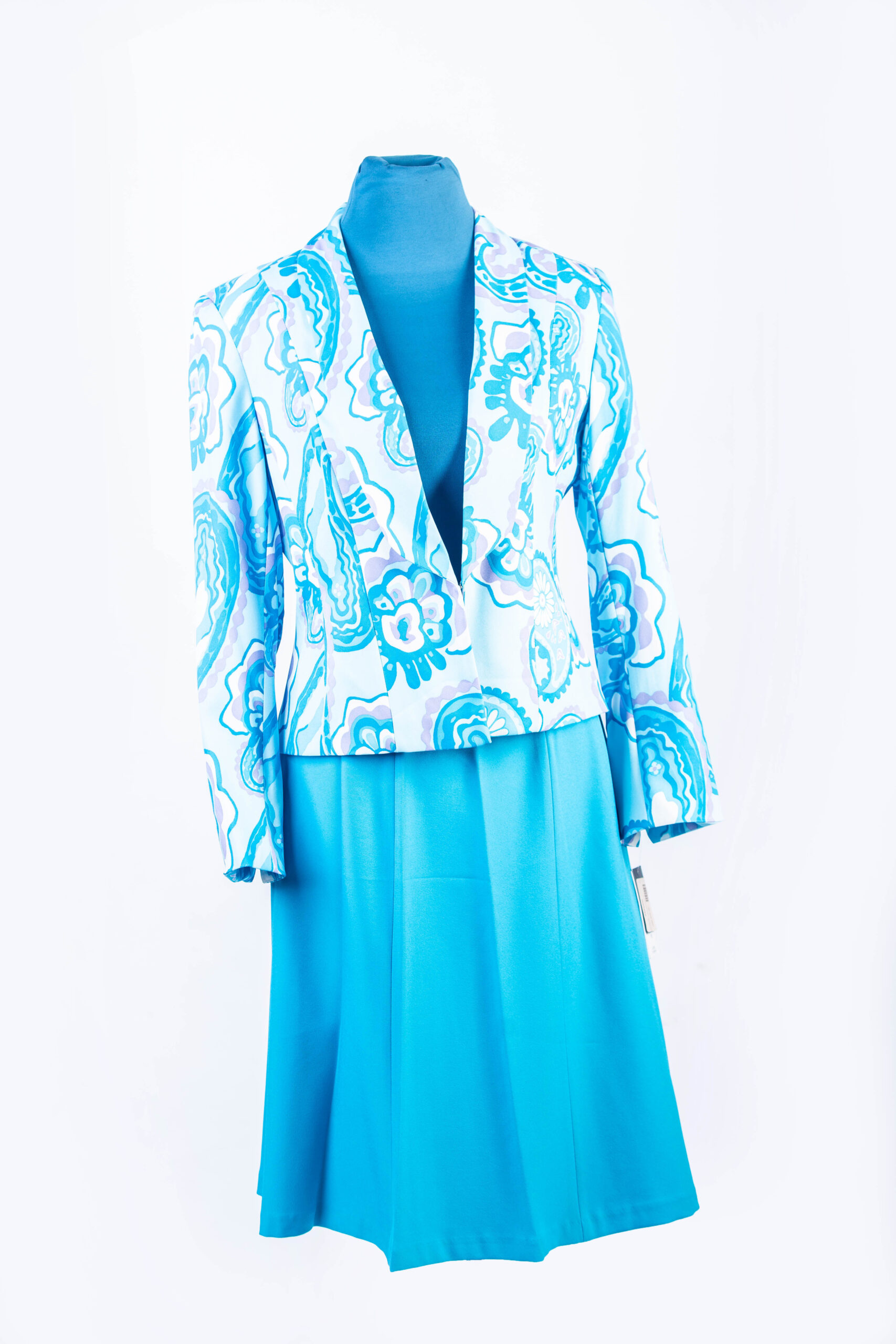 LILAC/BLUE/WHITE GEOPRINT MULTICOLOR LONGSLEEVE JACKET & BLUE FIT AND FLARED MIDI SKIRT