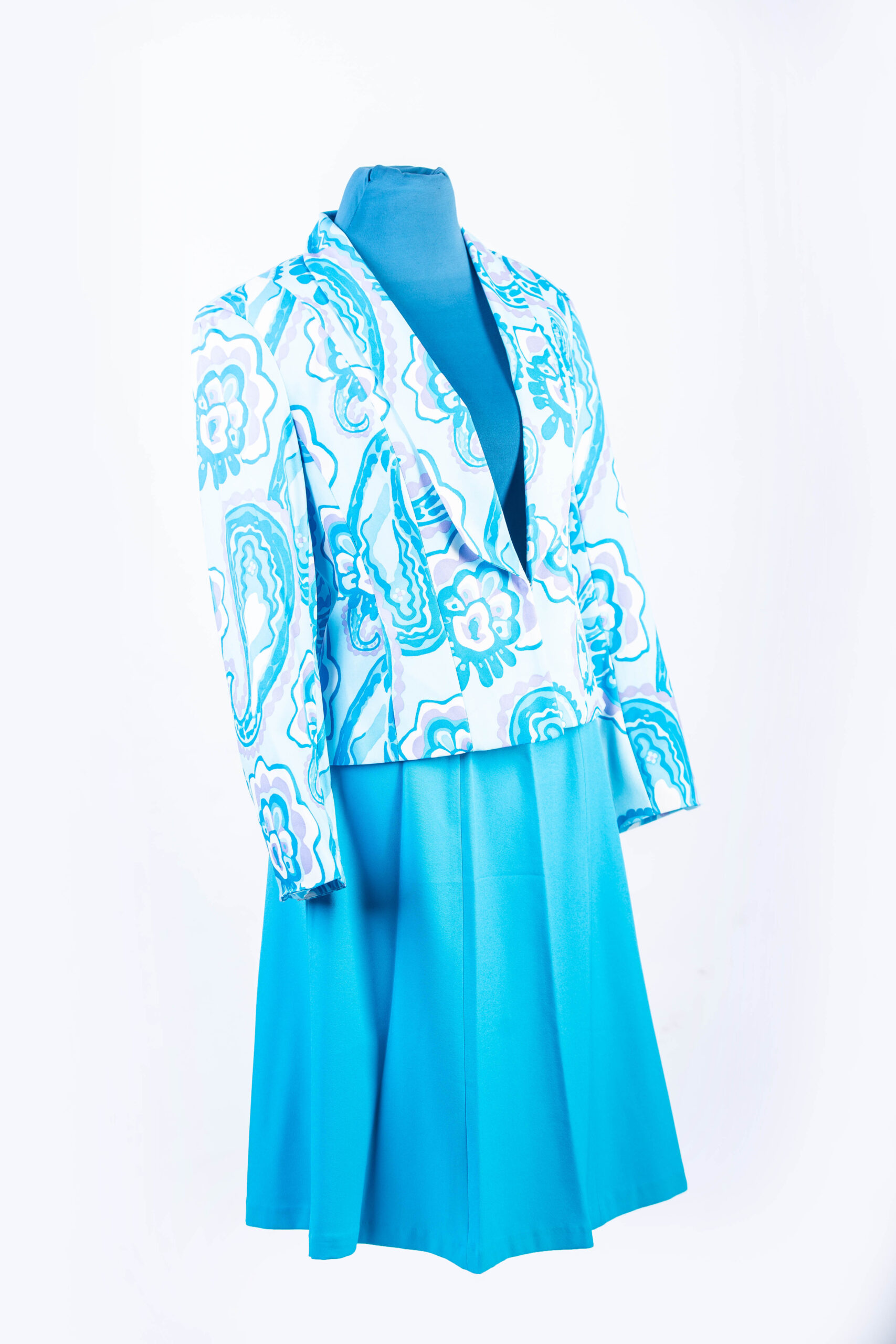 JOHN MEYER GEOPRINT LONGSLEEVE JACKET WITH BLUE MIDI SKIRT