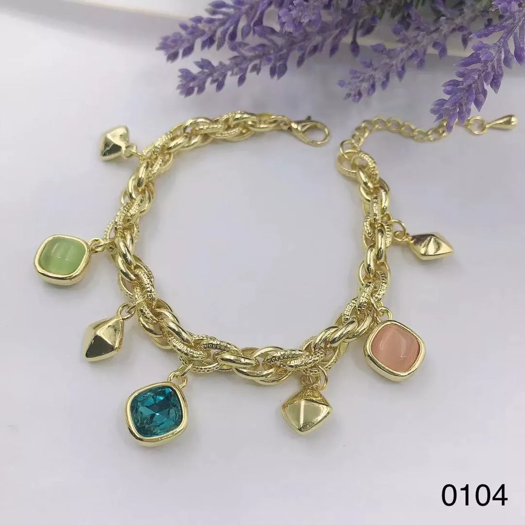 Be the first to review “jpg37BGOLD THICK LOOPS WITH GREEN BLUE PEACH SQAURE CRYSTAL STONES GOLD CHARMS BRACELET”