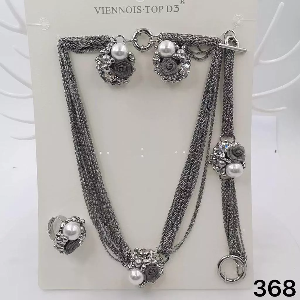 VIENNOIS SILVER MESH CHAIN EARRING WITH WHITE PEARLS, BLACK STONE AND RUSTIC ROSE DETAIL WITH MATCHING EARRING, RING AND BRACELET SET