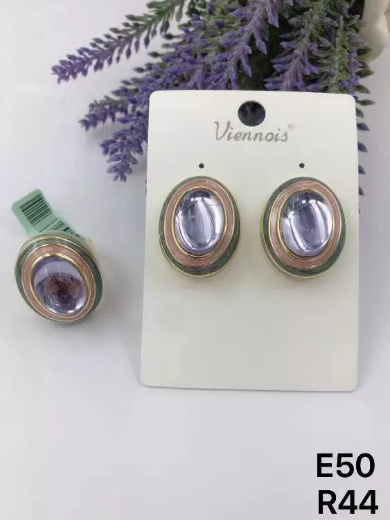 VIENNOIS PINK,GREEN,GOLD CERAMIC OVAL DETAILS WITH LILAC CENTER STONE EARRING AND MATCHING RING