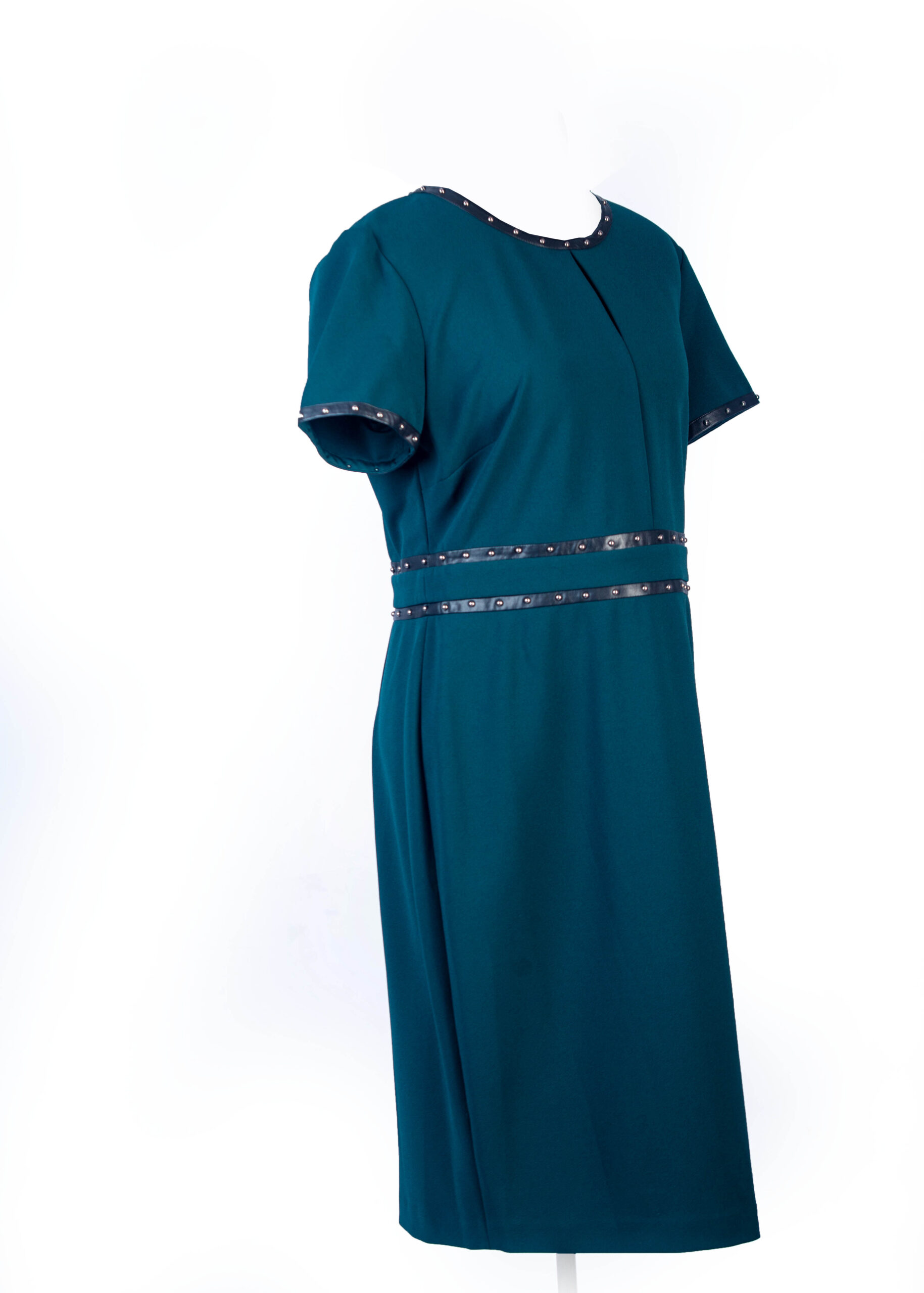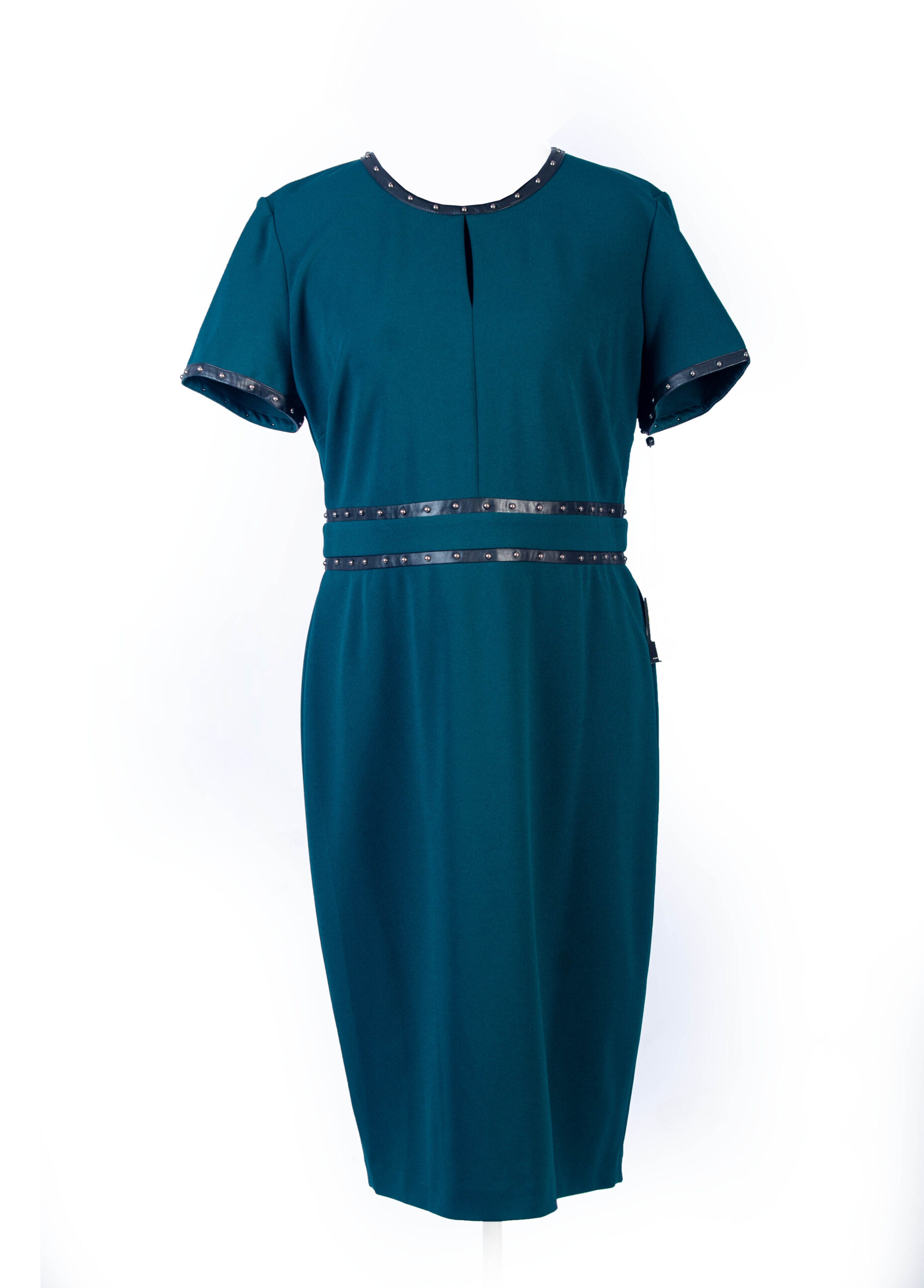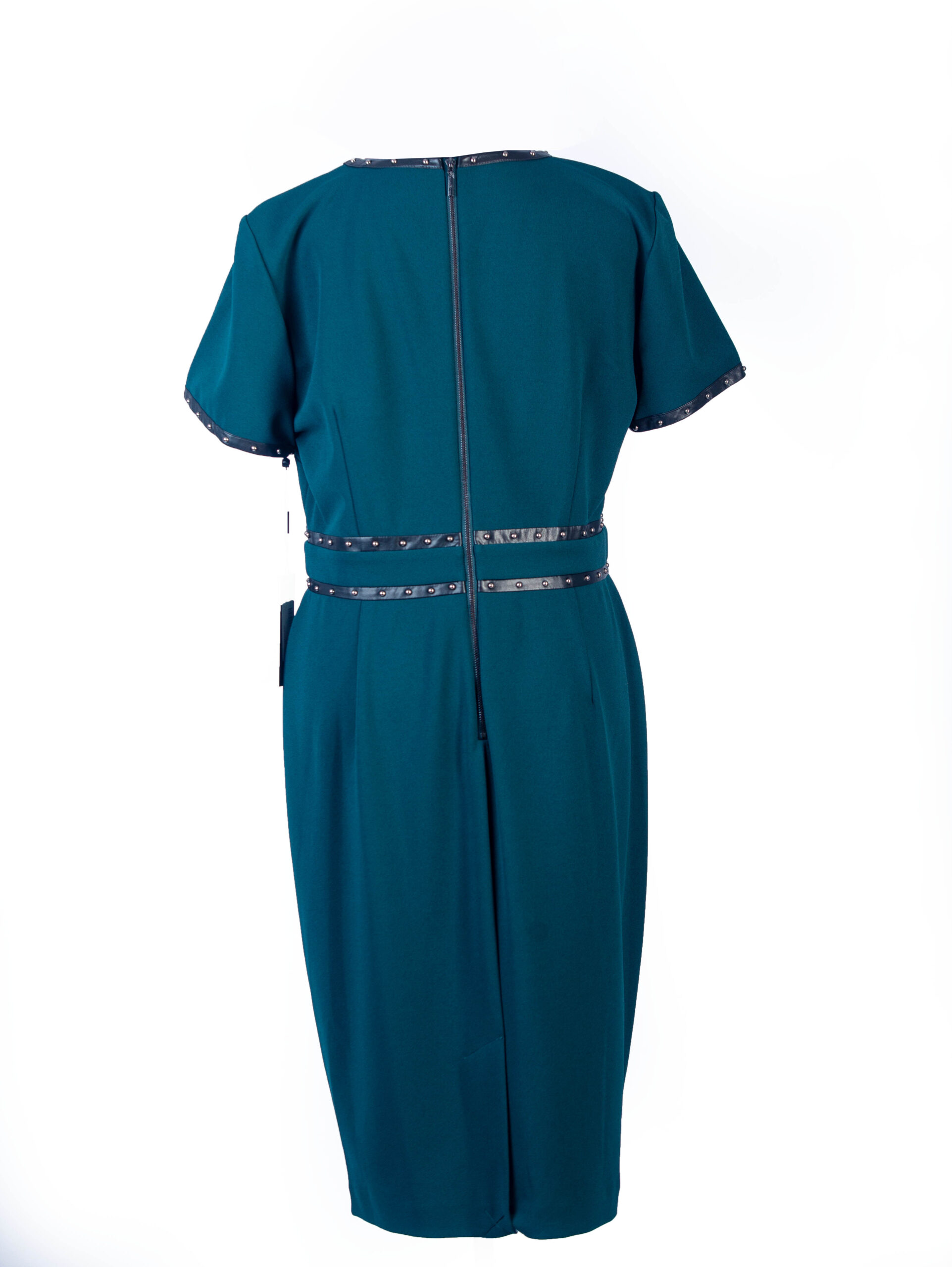 KARL LARGEFELD FOREST GREEN WITH LEATHER TAPED BRASS STUDDED SHORTSLEEVE DRESS