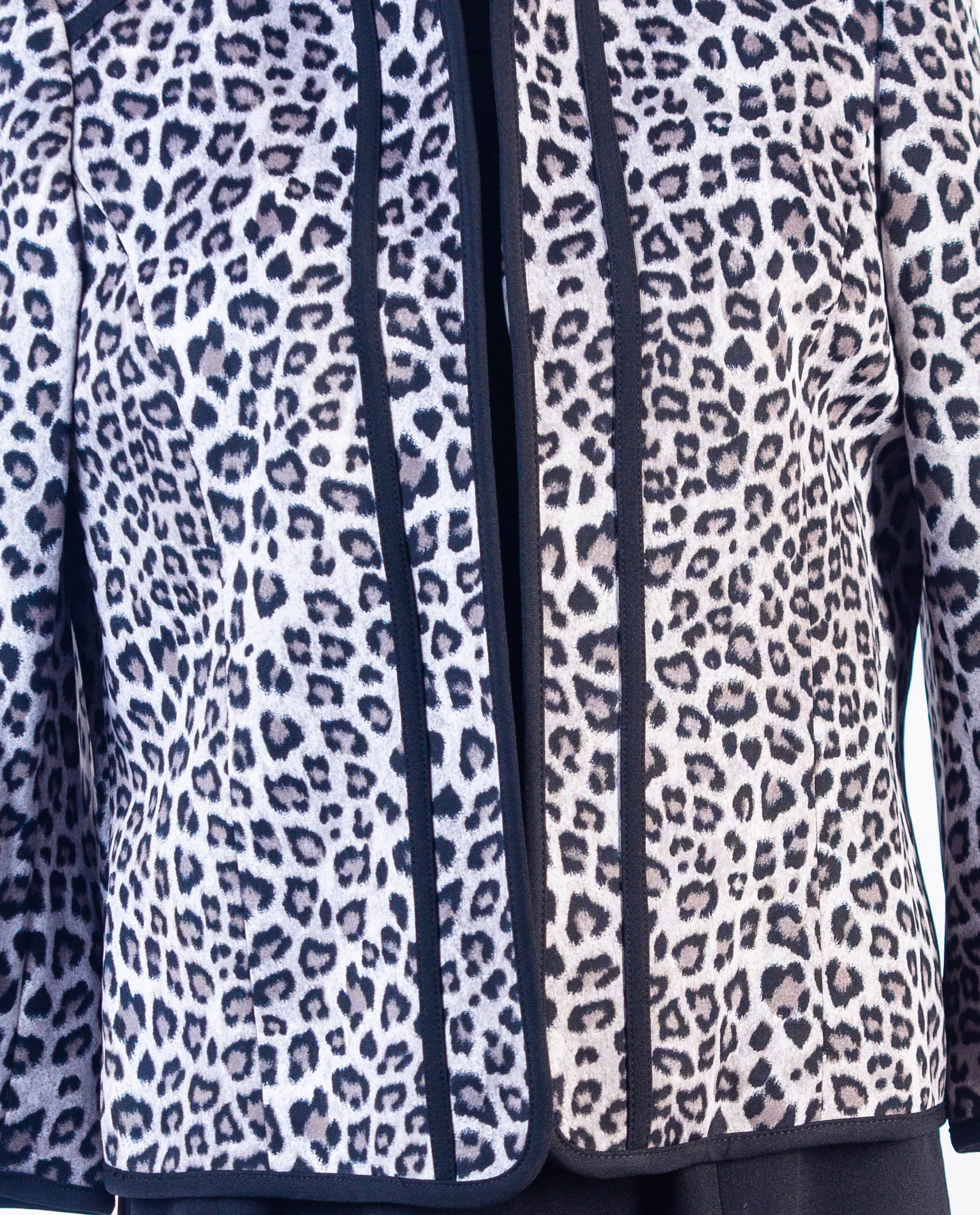 CHARCOAL LEOPARD PRINT JACKET WITH OPEN FRONT AND BLACK TAPING