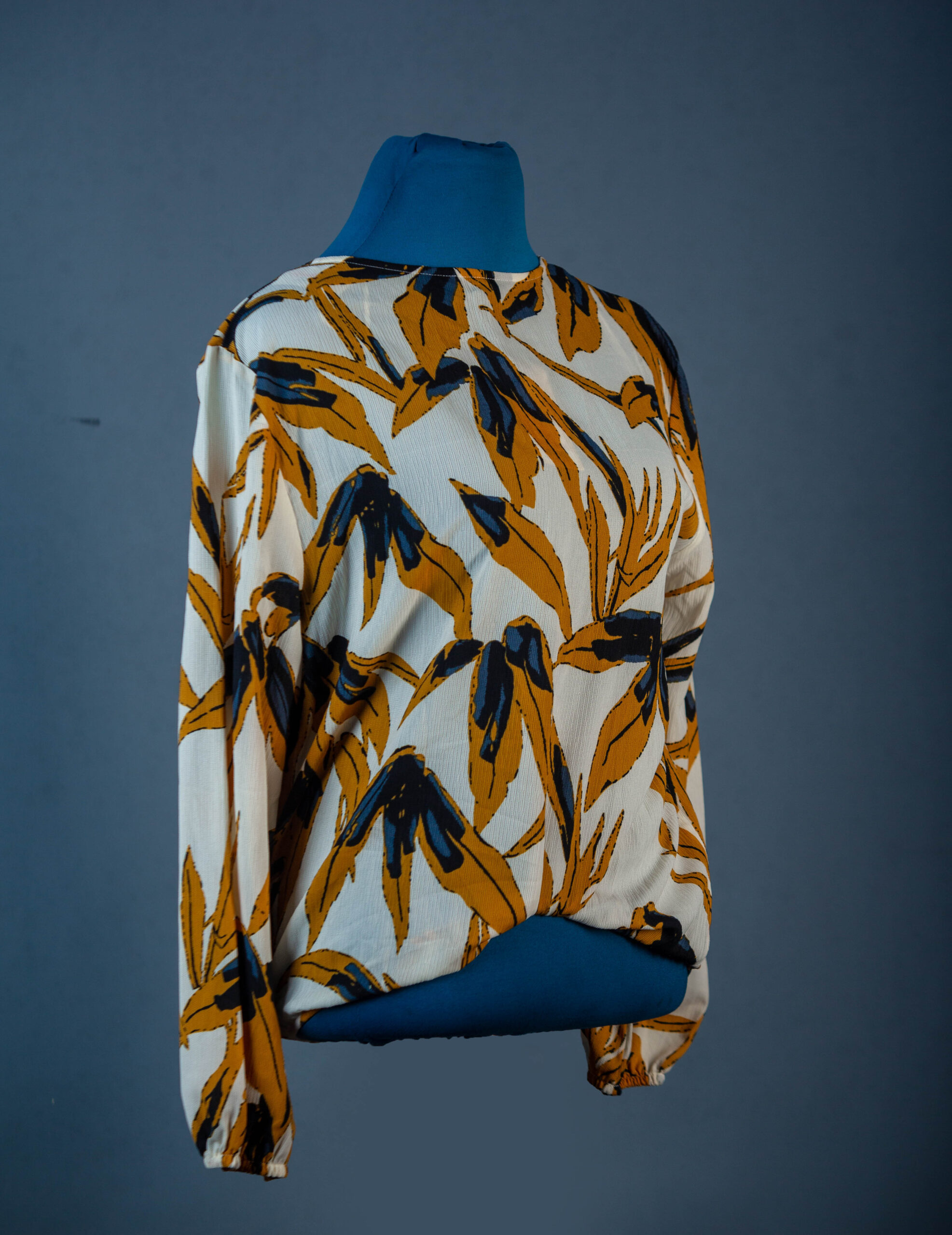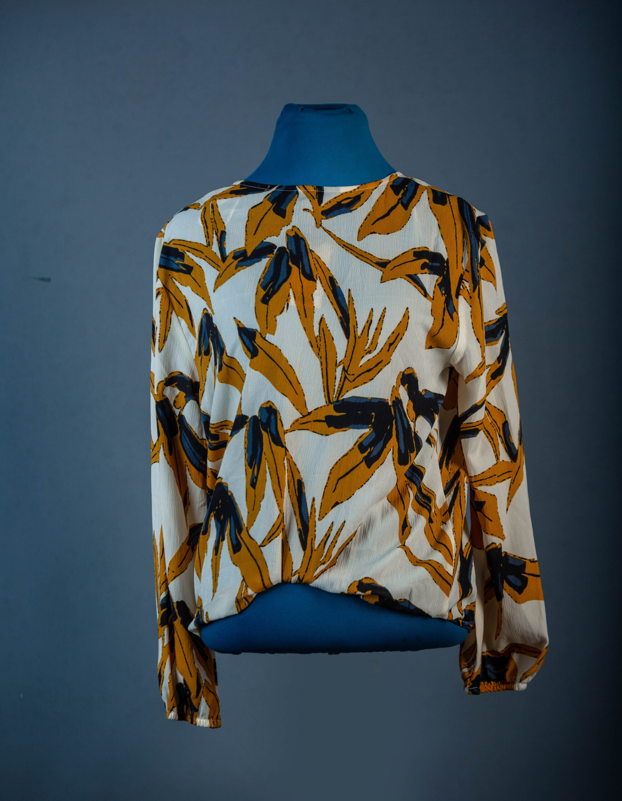 LIPSY CREAM WITH MUSTARD/BLACK LEAF PRINTS LONGSLEEVE FAUX WRAP TOP