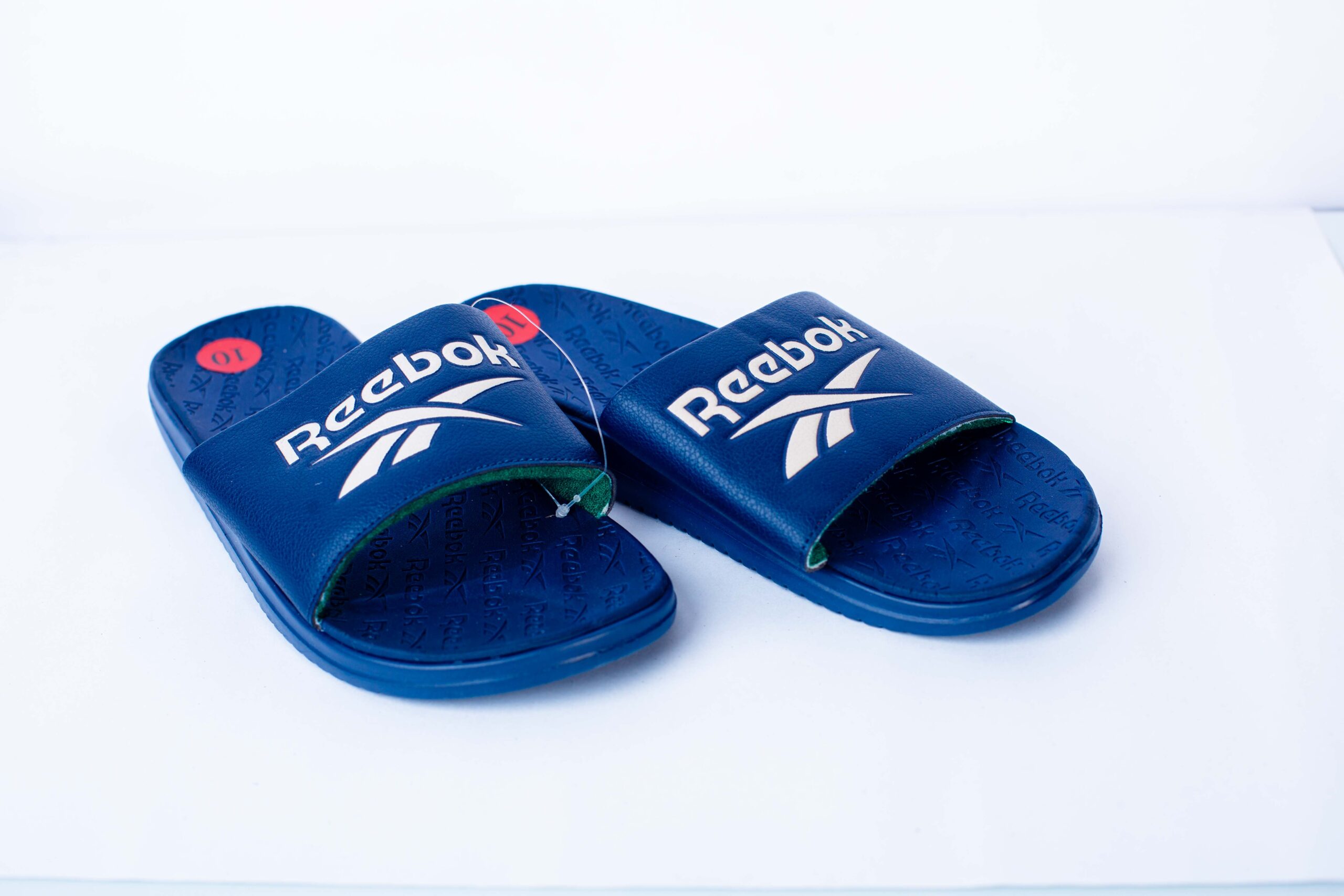 NAVY BLUE SLIPPERS WITH WHITE REEBOK LOGO
