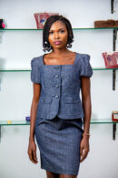 ENGLISH ROSE INDIGO DENIM POLYESTER&RAYON SKIRT SUIT WITH DIP NECK CUT&BALOON SLEEVES &FRONT POCKETS & DOUBLE FRONT OVERLAP SLIT HEM