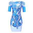 BLUE/WHITE/BEIGE GEO-PRINT DRESS WITH 3/4 SLV& DROOP NECK&BACK ZIP
