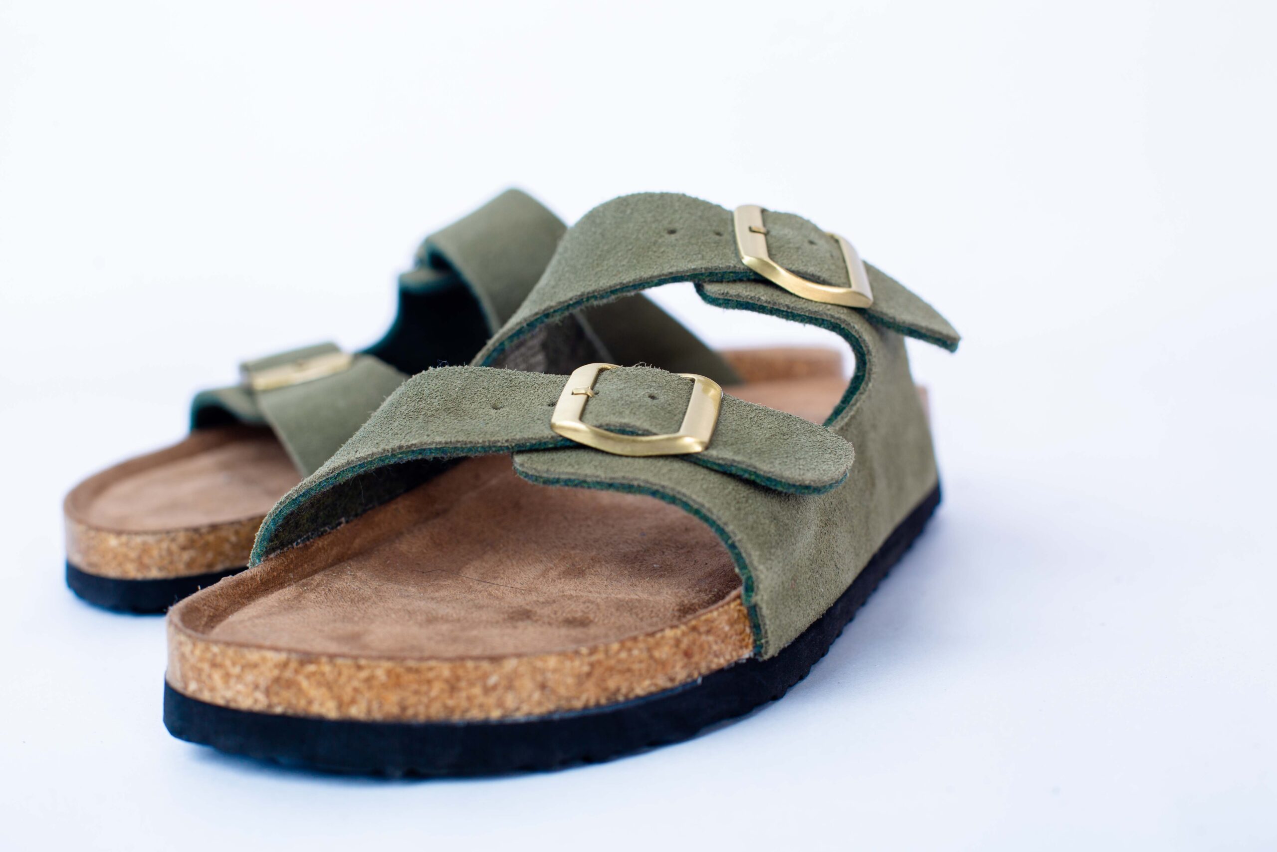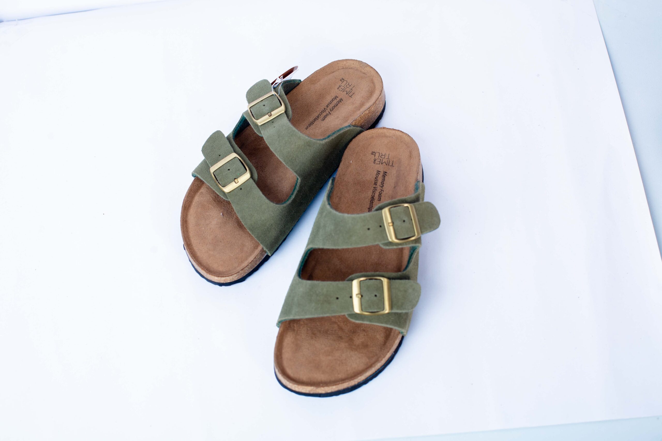 TIME AND THRU MOSS GREEN FAUX SUEDE SLIPPERS